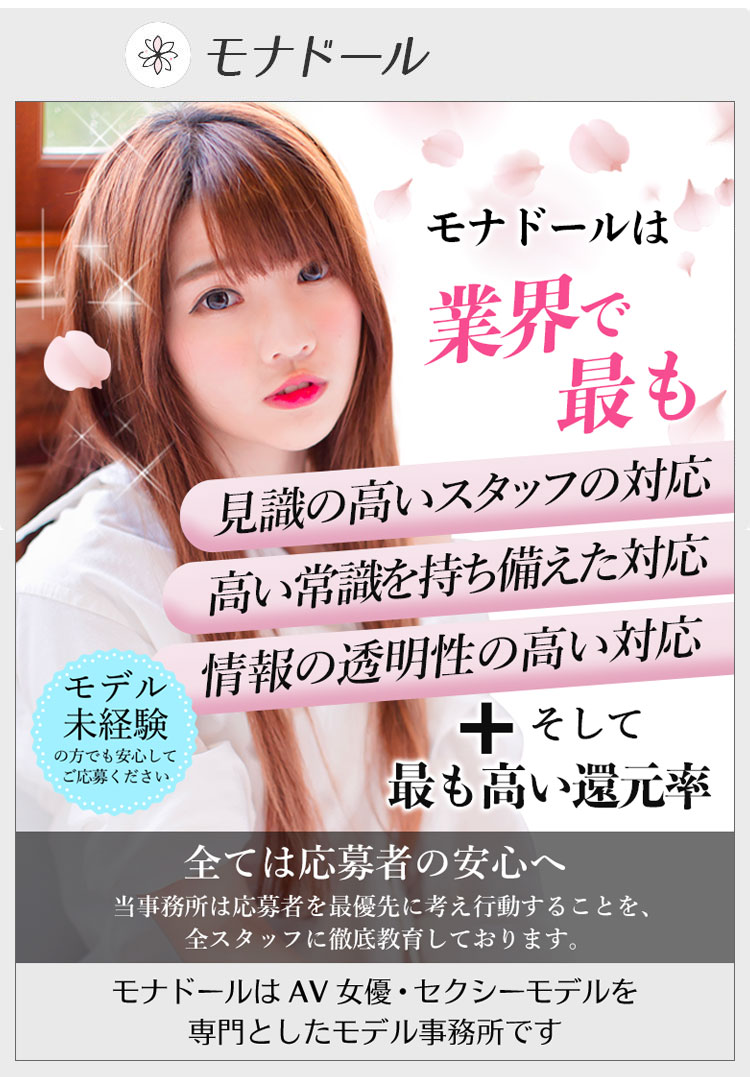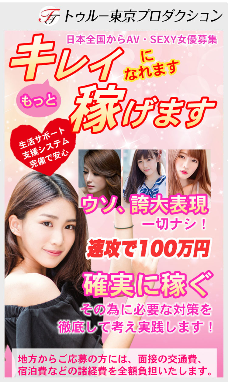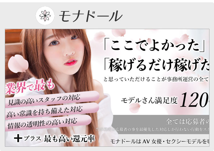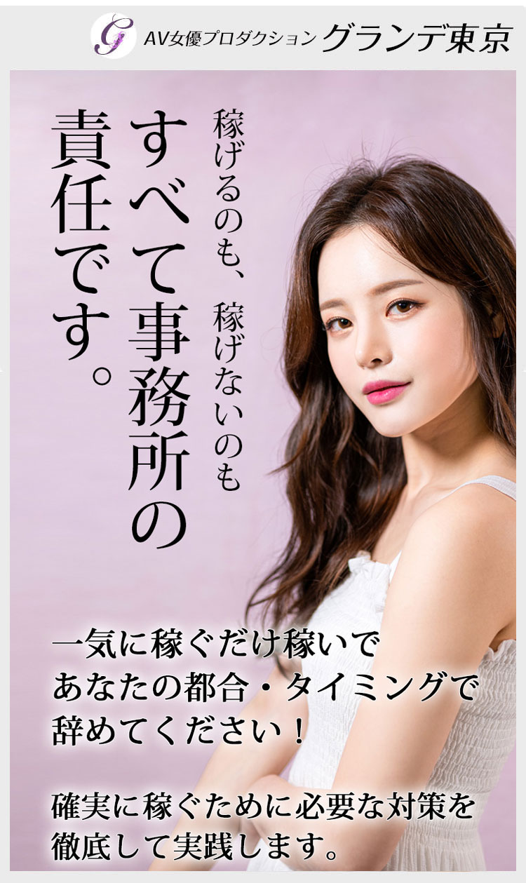 また過去にAV女優を経験し引退された方の復活や他の事務所からの移籍も多く、AV女優募集にご応募頂ける方の一人一人違う生活環境や目標金額に応じて、稼げるプログラムの提案を事務所と相談しながら活動できる事務所である。