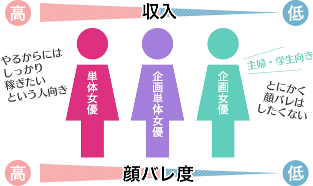 前の「AV女優のお仕事って?」でもお話ししたように単体女優や企画単体女優はギャラも高い分露出もしますし、メーカーさんも専属女優を売り出すためにいろいろなイベントなどもやりすので、顔バレが絶対イヤという方は企画女優をお勧めします。